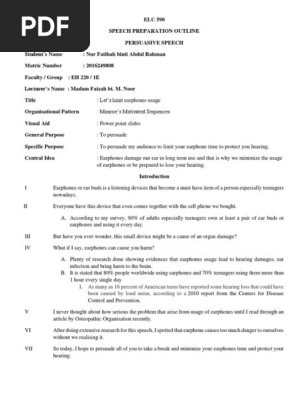 Elc 590 Persuasive Speech Outline Headphones Hearing Loss