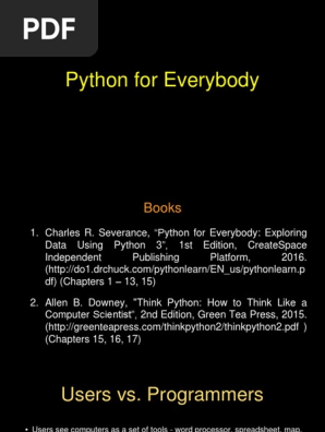 Python for everybody pdf. Hello and welcome to my site where you can work through my course materials related to my free python for everybody text book. Download python for everybody is designed to introduce students to programming and software development through the lens of exploring data. The primary difference between a computer science approach and the informatics approach taken in this book is a greater focus on using python to solve data analysis problems common in the world of informatics.