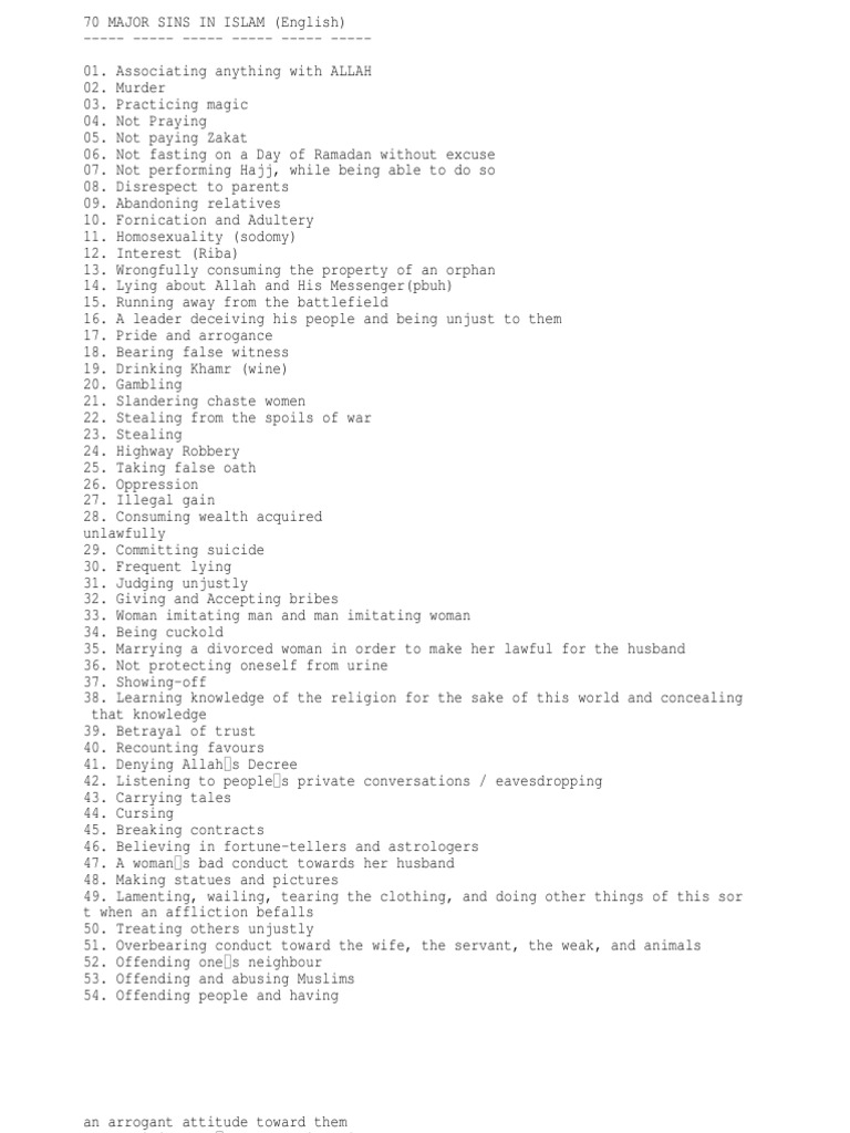 The list of seventy major sins given by the shafi i sunni scholar al dhahabi are as follows.
