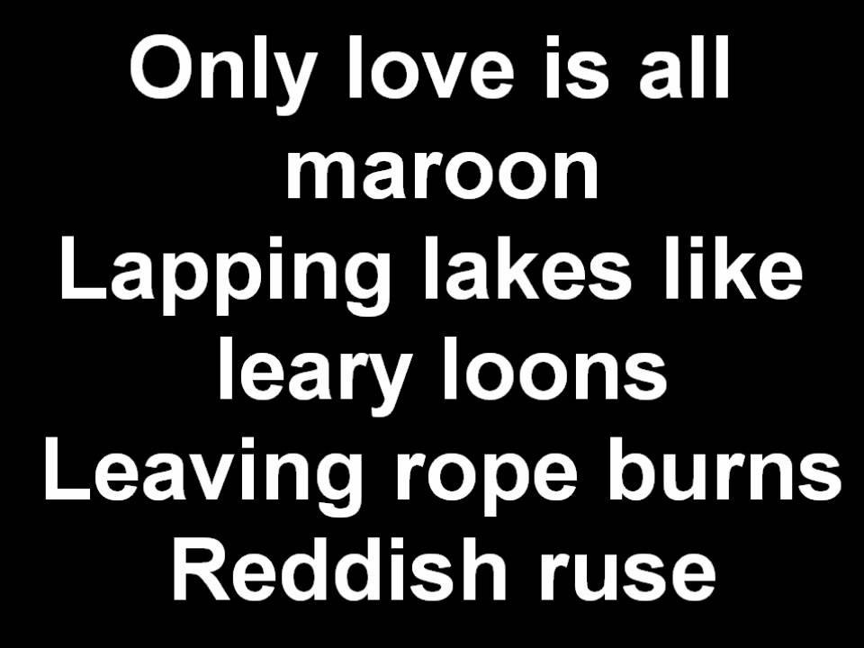 Gluey feathers on a flume sky is womb and she s the moon. Only love is all maroon lapping lakes like leery loons leaving rope burns reddish ruse.