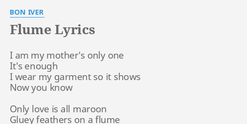 Flume bon iver lyric. Nothing s more only love is all maroon lapping lakes like leary loons leaving rope burns reddish rouge only love is all maroon gluey feathers on a flume sky is womb and she s the moon. Bon iver flume by. I am my mother on the wall with us all i move in water shore to shore nothing s more.