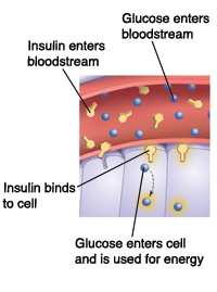 When insulin is released from the pancreas it travels through the bloodstream to the body s cells and tells the cell doors to open up to let the glucose in.