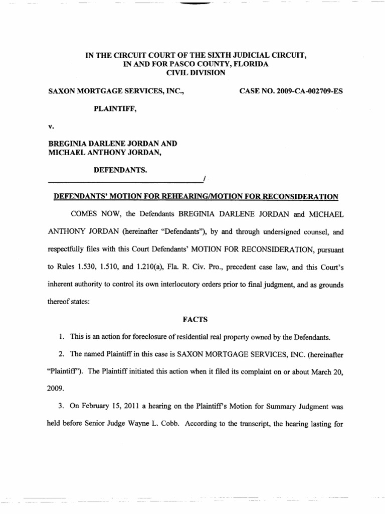 Foreclosure Motion For Rehearing Reconsideration Saxon V Jordan