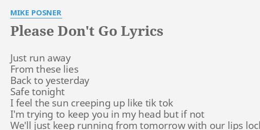 Let s run away from these lies back to yesterday safe tonight i feel the sun creeping up like tick tock i m trying to keep you in my head but if not we ll just keep running from tomorrow with our lips locked. About please don t go please don t go is a song by american recording artist mike posner released as the second single from his debut album 31 minutes to takeoff 2010.