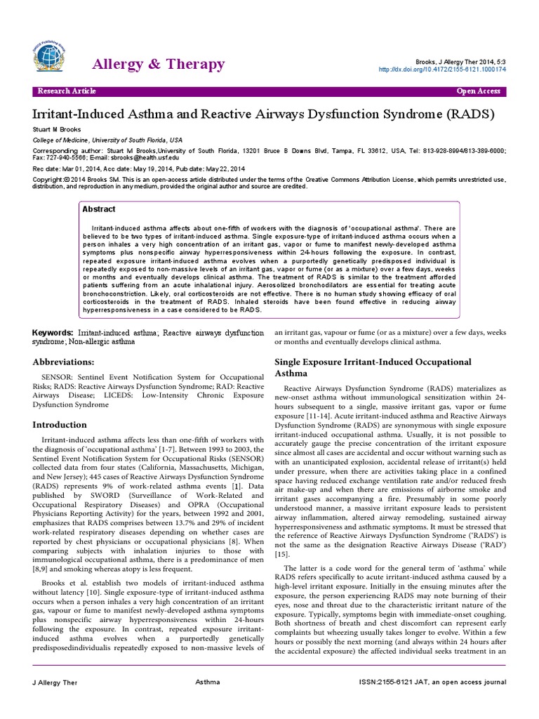 1 3 rads cases originally described by brooks and subsequent reports typically involved intense high level exposure to a pulmonary irritant which resulted in acute respiratory symptoms of a severity generally requiring immediate medical attention and hospitalization. The symptoms mimic asthma but appear unresponsive to asthma treatments. In fact increasingly the term is being commonly used among specialists in pulmonary medicine.