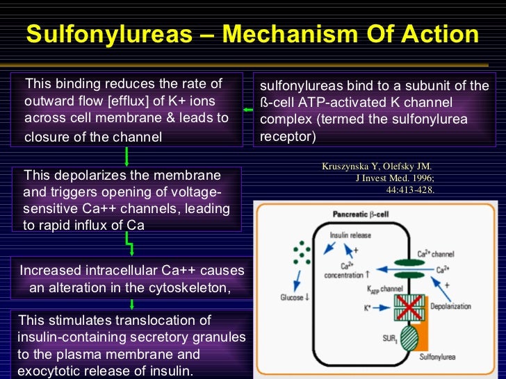 Sulfonylureas mechanism of action. They primarily act by binding to the sur subunit of the atp sensitive potassium k atp channel and inducing channel closure. These drugs exert their hypoglycaemic effects by stimulating insulin secretion from the pancreatic beta cell. Recent studies have shown that.