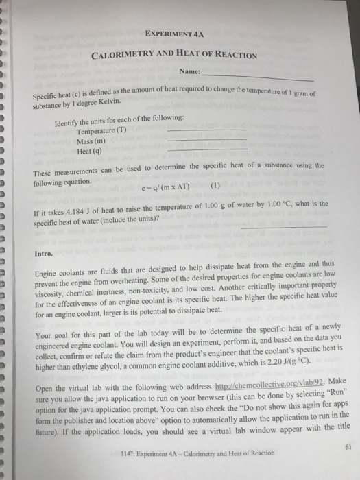Solved Experiment 4a Calorimetry And Heat Of Reaction Nam
