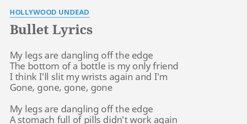 Hollywood undead bullet lyrics. My legs are dangling off the edge the bottom of the bottle is my only friend i think i ll slit my wrist again and i m gone gone gone gone. My legs are dangling off the edge the bottom of the bottle is my only friend i think i ll slit my wrists again and i m gone gone gone gone my legs are dangling off the. Hollywood undead lyrics bullet charlie scene my legs are dangling off the edge the bottom of the bottle is my only friend i think i ll slit my wrist again and i m gone gone gone gone.