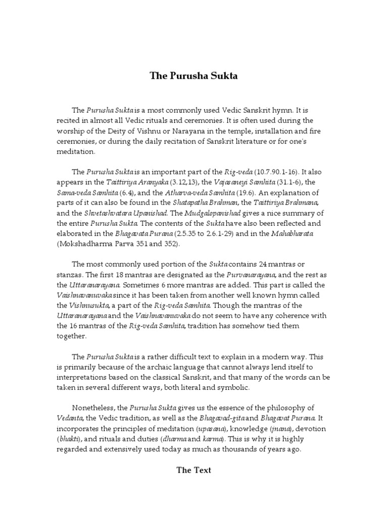 And it is widely commented and translated in several languages. In early vedas purusha was a cosmic being whose sacrifice by the gods created all life. The purusha sukta hymn is attributed to a sage named narayana and is therefore called narayana anuvaka.