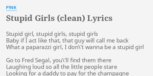 Stupid girls pink lyrics. Stupid girl stupid girls stupid girls maybe if i act like that that guy will call me back porno paparazzi girl i don t wanna be a stupid girl go to fred segal you ll find them there laughing loud so all the little people stare looking for a daddy to pay for the champagne drop a name what happened to the dreams of a girl president. I don t wanna be a stupid girl go to fred segal you ll find them there laughin loud so all the little people stare lookin for a daddy to pay for the champagne. Pink stupid girls lyrics.