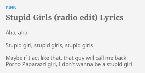 Maybe if i act like that flipping my blond hair back push up my bra like that stupid girl. Paroles de la chanson stupid girls par pink hhuh uhhuh stupid girl woo stupid girls stupid girls maybe if i act like that that guy will call me back what a paparazzi girl yeah i don t wanna be a stupid girl uhhuh go to fred segal you ll find them there laughing loud so all the little people stare. Stupid girls is a song recorded by american singer pink from her fourth studio album i m not dead released as the lead single from the album the lyrics condemn sexism and encourages.