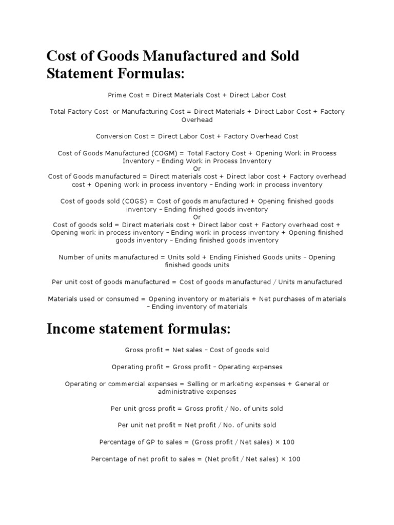 Cost of goods manufactured formula. Plus the cost of the direct labor used. Including all direct materials direct labor and factory overhead. To the beginning work in process inventory and subtracting the ending goods in process inventory.