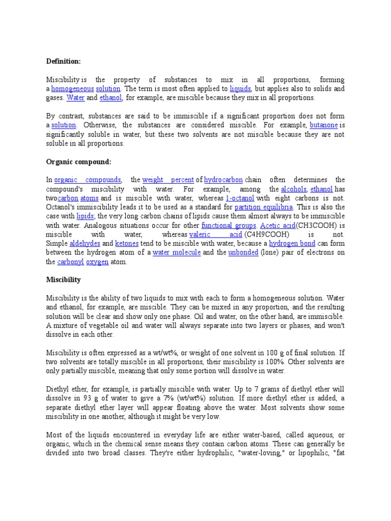 Does miscible mean soluble. Alcohol and water are miscible. Solubility definition in chemistry. Octanol with eight carbons is practically insoluble in water and its immiscibility leads it to be used as a standard for partition equilibria.