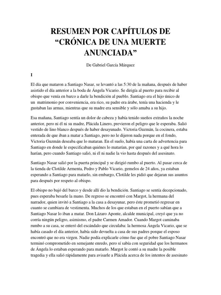 Resumen Por Cap Cronica De Una Muerte Anunciada Santiago