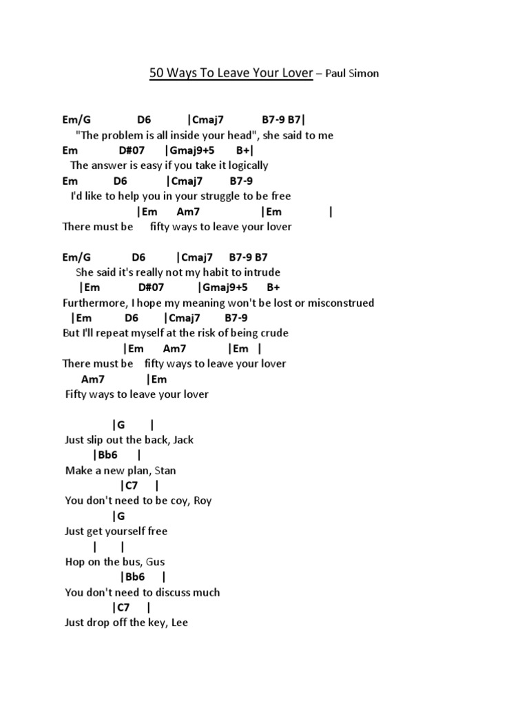 Fifty ways to leave your lover you just slip out the back jack make a new plan stan you don t need to be coy roy just get yourself free hop on the bus gus you don t need to discuss much just drop off the key lee and get yourself free ooh slip out the back jack make a new plan stan you don t need to be coy roy just listen to me hop on.