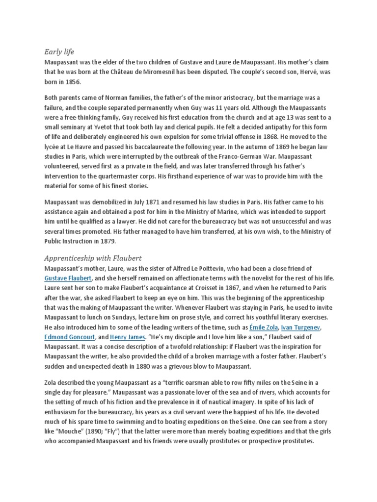5 august 1850 6 july 1893 was a 19th century french author remembered as a master of the short story form and as a representative of the naturalist school who depicted human lives and destinies and social forces in disillusioned and. By guy de maupassant. The narrator gives an account of the girl s background and reputation.