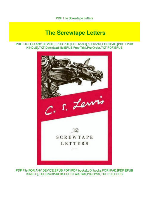 Lewis s the screwtape letters for your kindle tablet ipad pc or mobile. The screwtape letters pdf summary c. The screwtape letters pdf 225 pages 2001 5 mb 3 046 downloads english in 1942 english writer cs lewis published the book the screwtape letter pdf in which he collected the letters of a great demon named screwtape written for a little devil named wormwood to guide.