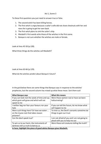 Macbeth Act 1 Scene 3 Questions Worksheet Teaching Resources