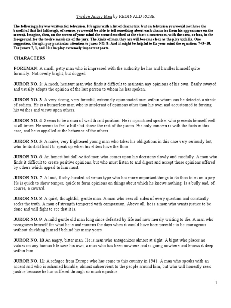 Read script 12 angry men 1957 written byreginald rose. It begins with a list of characters but on television you would not have the benefit of that list although of course you would be able to tell something about each character from his appearance on the screen. Should you wish to produce the play using a cast of eight women and five men you would order eight copies of code t43.