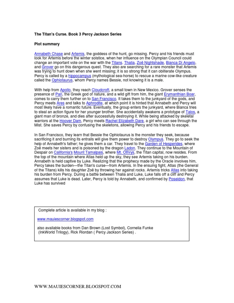 The titan s curse is an american fantasy adventure novel based on greek mythology written by rick riordan it was released on may 1 2007 and is the third novel in the percy jackson the olympians series and the sequel to the sea of monsters it is about the adventures of the 14 year old demigod percy jackson as he and his friends go on a dangerous quest to rescue his 14 year old demigod. Grover has found a pair of half blood siblings nico and bianca at the school where he pretends to be a student. In this particular novel protagonist percy jackson and his friends.