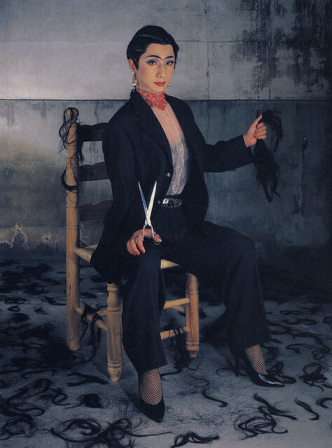 Self portrait with cropped hair 1940 kahlo is depicted in a man s suit holding a pair of scissors with her fallen hair around the chair in which she sits.
